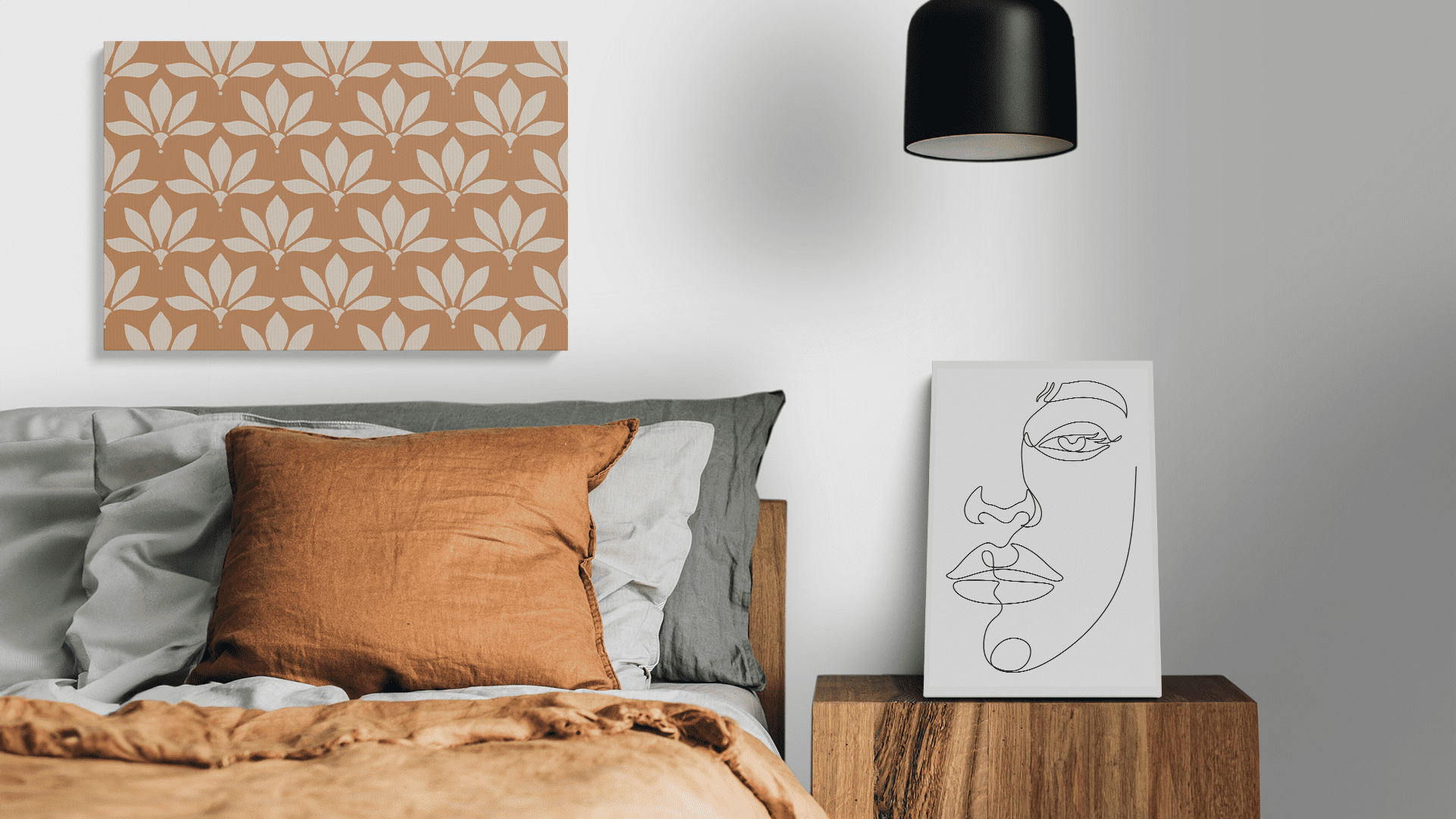 Minimal Floral Line Art Canvas Print displayed in a modern bedroom setting